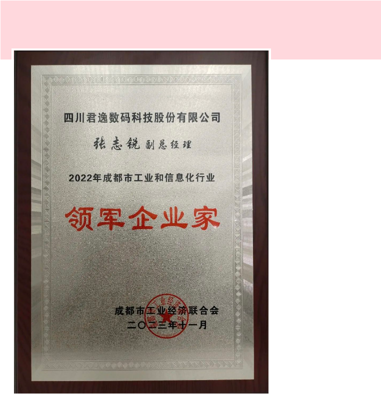 2023年12月13日,成都市工業(yè)經(jīng)濟聯(lián)合會召開2022年成都市工業(yè)和信息化領軍企業(yè)百強及領軍企業(yè)家表彰大會。君逸數(shù)碼榮登“2022年成都市工業(yè)和信息化行業(yè)領軍企業(yè)”百強榜單,君逸數(shù)碼副總經(jīng)理張志銳榮獲“領軍企業(yè)家”榮譽稱號。