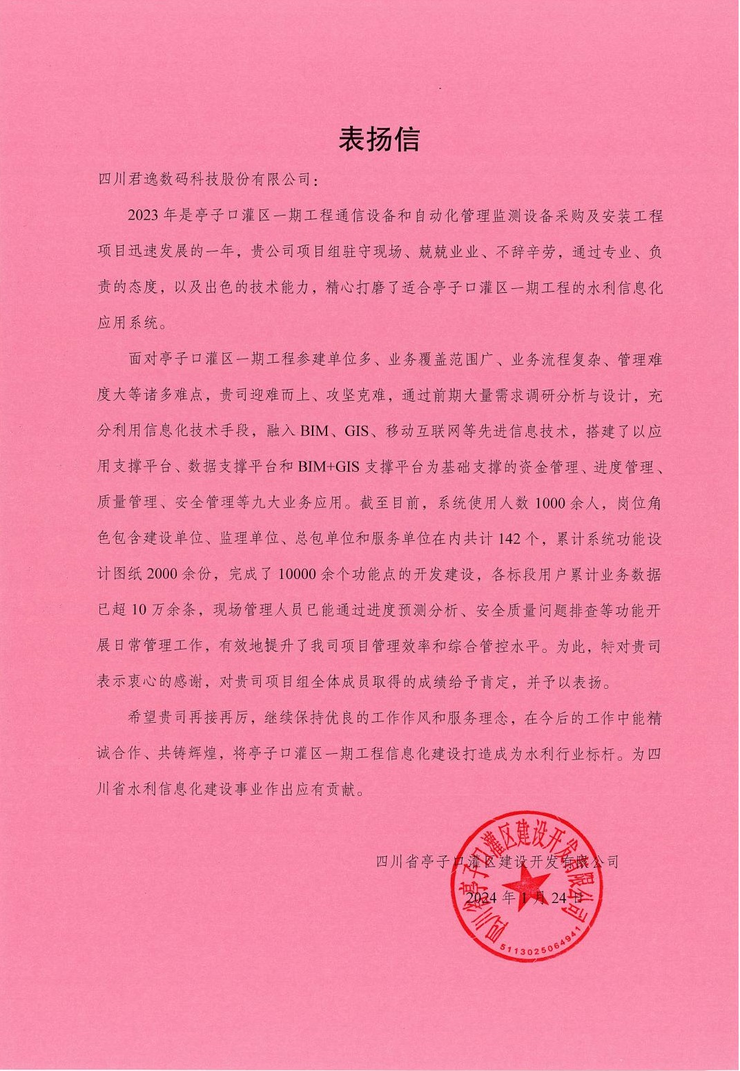 感謝信中表示:“面對亭子口灌區(qū)一期工程參建單位多、業(yè)務覆蓋范圍廣、業(yè)務流程復雜、管理難度大等諸多難點,君逸數(shù)碼團隊迎難而上、攻堅克難,通過前期大量需求調研分析與設計,充分利用信息化技術手段,融入BIM、GIS、移動互聯(lián)網(wǎng)等先進信息技術,搭建了以應用支撐平臺、數(shù)據(jù)支撐平臺和BIM+GIS支撐平臺為基礎支撐的資金管理、進度管理、質量管理、安全管理等九大業(yè)務應用。截至目前,系統(tǒng)使用人數(shù)1000余人,崗位角色包含建設單位、監(jiān)理單位、總包單位和服務單位在內共計142個,累計系統(tǒng)功能設計圖紙2000余份,完成了10000余個功能點的開發(fā)建設,各標段用戶累計業(yè)務數(shù)據(jù)已超10萬余條,現(xiàn)場管理人員已能通過進度預測分析、安全質量問題排查等功能開展日常管理工作,有效地提升了亭子口灌區(qū)公司項目管理效率和綜合管控水平。”
