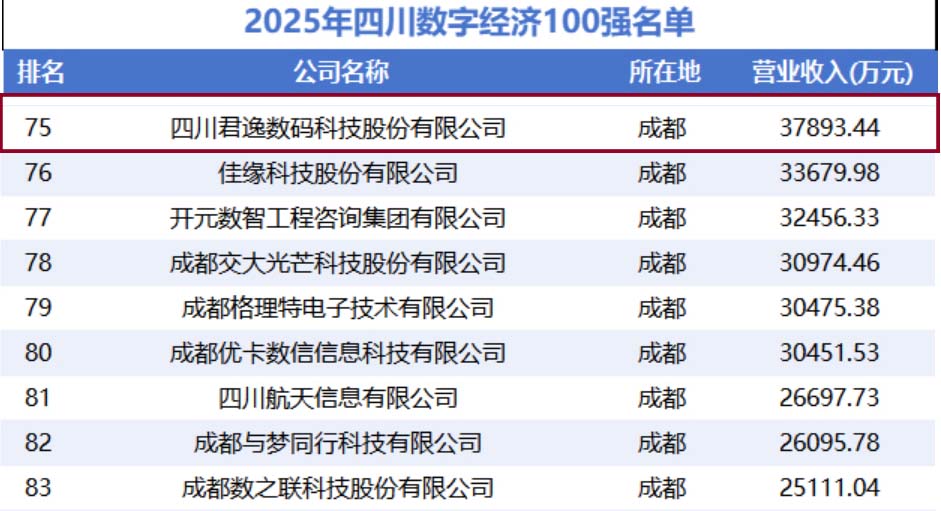 10月23日,2025四川大企業(yè)大集團(tuán)發(fā)展大會(huì)在成都隆重舉行。大會(huì)現(xiàn)場(chǎng),四川省企業(yè)聯(lián)合會(huì)發(fā)布了《四川100強(qiáng)企業(yè)發(fā)展報(bào)告(2025)》,并揭曉了四川企業(yè)100強(qiáng)、制造業(yè)100強(qiáng)、建筑業(yè)100強(qiáng)、服務(wù)業(yè)100強(qiáng)及數(shù)字經(jīng)濟(jì)100強(qiáng)五大榜單。君逸數(shù)碼憑借在智慧城市建設(shè)和數(shù)字經(jīng)濟(jì)領(lǐng)域的卓越表現(xiàn)與創(chuàng)新實(shí)力,成功入選 “2025四川數(shù)字經(jīng)濟(jì)100強(qiáng)” 榜單。