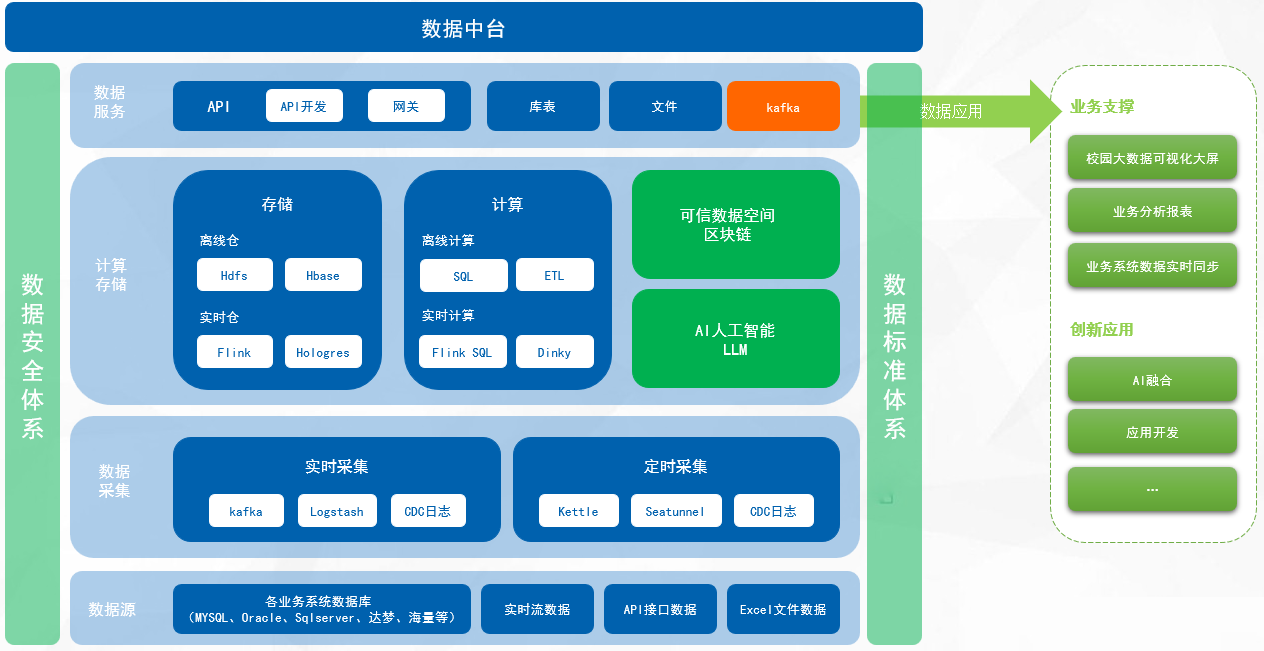 數(shù)據(jù)中臺是學(xué)校內(nèi)外部多源數(shù)據(jù)進(jìn)行統(tǒng)一采集、治理、建模、服務(wù)化的綜合平臺,形成可持續(xù)復(fù)用數(shù)據(jù)資源的機(jī)制。其本質(zhì)是“數(shù)據(jù)倉庫+數(shù)據(jù)服務(wù)中間件”,強(qiáng)調(diào)數(shù)據(jù)的業(yè)務(wù)價(jià)值轉(zhuǎn)化,而非僅存儲(chǔ)管理。